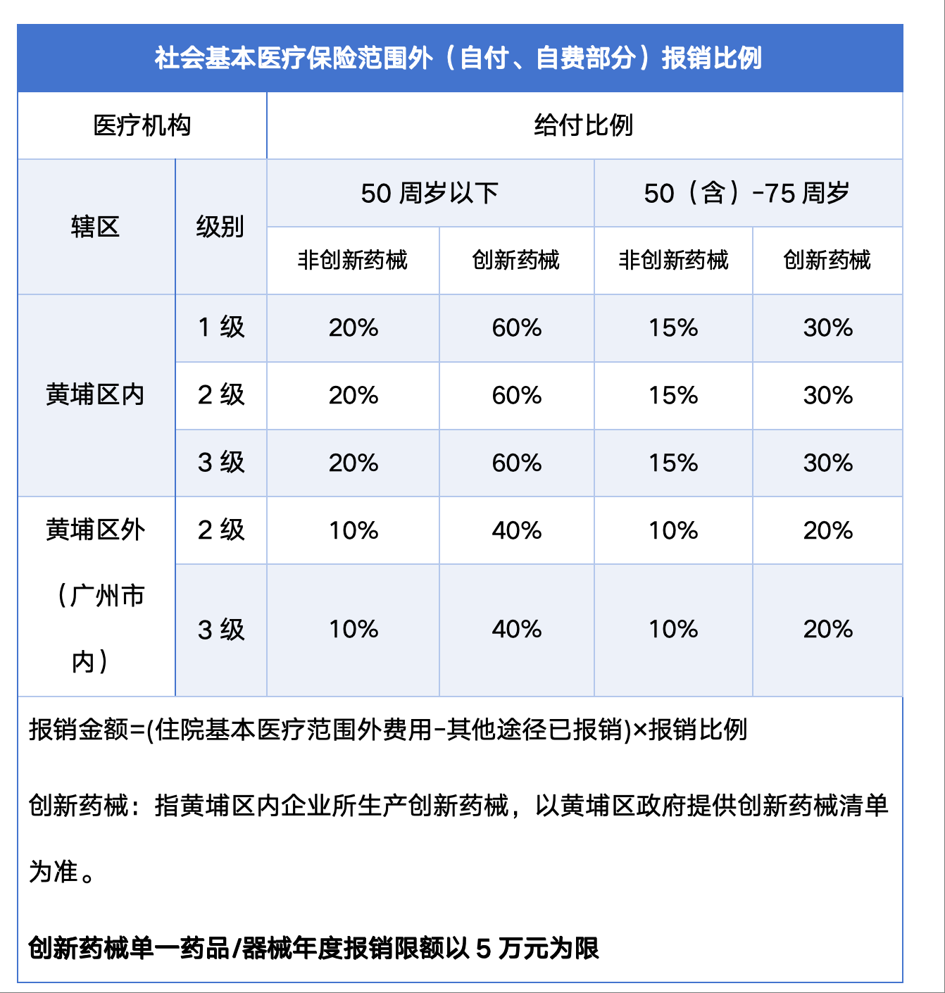 情况:因宫颈癌在黄埔区三甲医院住院,住院医疗费用10万元。医保报销后个人支付6.6万元,其中医保范围内1.8万元,医保范围外4.8万元(其中:非创新药械费用2.8万元,创新药械费用2万元。)