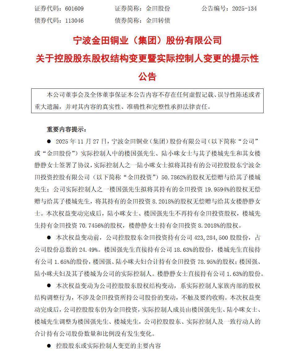 11月29日,宁波金田铜业(集团)股份有限公司(金田股份,601609.SH)在上海证券交易所发布《关于控股股东股权结构变更暨实际控制人变更的提示性公告》等多个公告,披露公司控股股东金田投资股权发生变更,实控人陆小咪、楼国强将所持有的金田投资股权赠与两名子女,公司实际控制人发生变更。